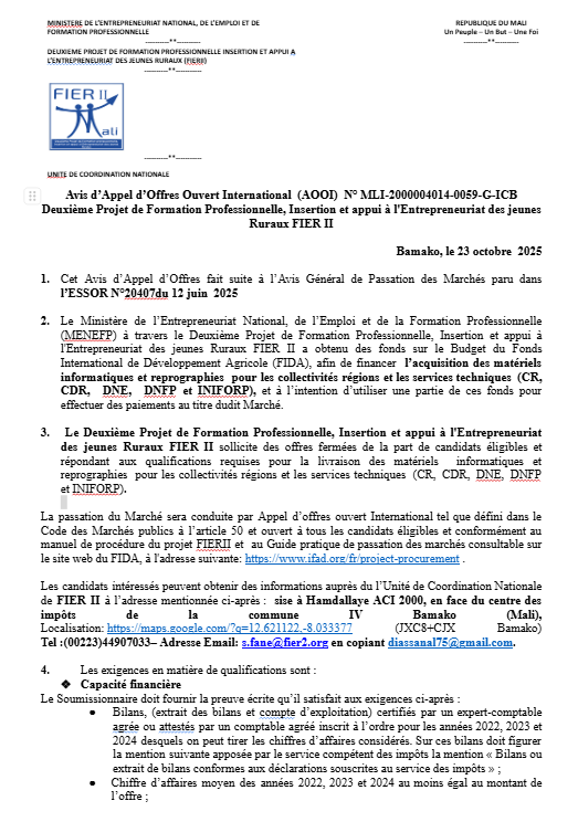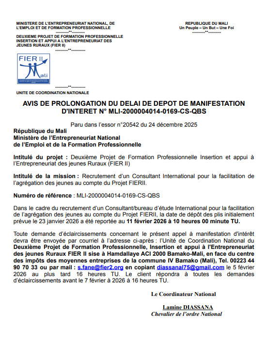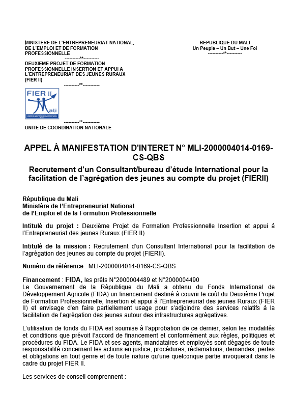 Le Second projet de formation professionnelle, d’insertion et d’appui à l’entrepreneuriat des jeunes ruraux (FIER II) a pour objectif de développement de promouvoir l’entrepreneuriat dans les zones rurales, et de faciliter l’intégration économique des jeunes dans des filières agricoles et dans des sous-secteurs non agricoles.
