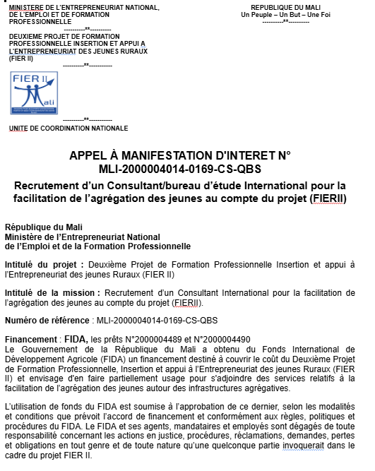 Le Deuxième projet de Formation Professionnelle, Insertion et Appui à l’entrepreneuriat des jeunes ruraux (FIER II) a pour objectif de développement de promouvoir l’entrepreneuriat dans les zones rurales, et de faciliter l’intégration économique des jeunes dans des filières agricoles et dans des sous-secteurs non agricoles.