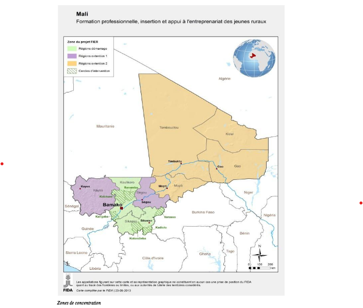 Il contribuera ainsi à réaliser le deuxième objectif stratégique du programme d’options stratégiques pour le pays (COSOP): promouvoir l’accès des petits producteurs aux marchés. - La zone géographique d’intervention correspond à la stratégie de ciblage du COSOP, qui englobe huit régions. L’exécution démarrera dans les 12 régions (cercles) les plus pauvres situées dans le sud du pays à forte densité de population: Koulikoro, Sikasso, Kayes et Ségou. Après avoir couvert ces « zones de concentration » (précédemment couvertes dans la première phase), le projet FIER 2 pourra élargir son champ d’action à des « zones d’extension » (incluant les régions de Mopti, Gao, Tombouctou et Kidal), en fonction d’une série de conditions à remplir, en particulier celles relatives aux problèmes de sécurité.